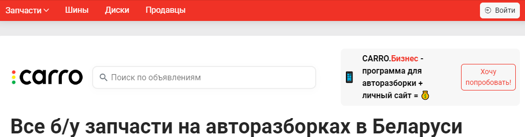 Войти в персональный раздел интернет-магазина б/у автозапчастей в Беларуси “Карро Бай”, сайт carro.by