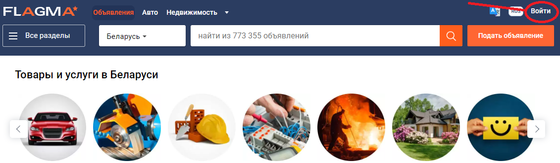 Вход в персональный раздел интернет-портала услуг и товаров, сайт flagma.by