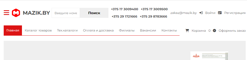 Вход в персональный раздел компании по предоставлению автозапчастей для МАЗ, сайт www.mazik.by